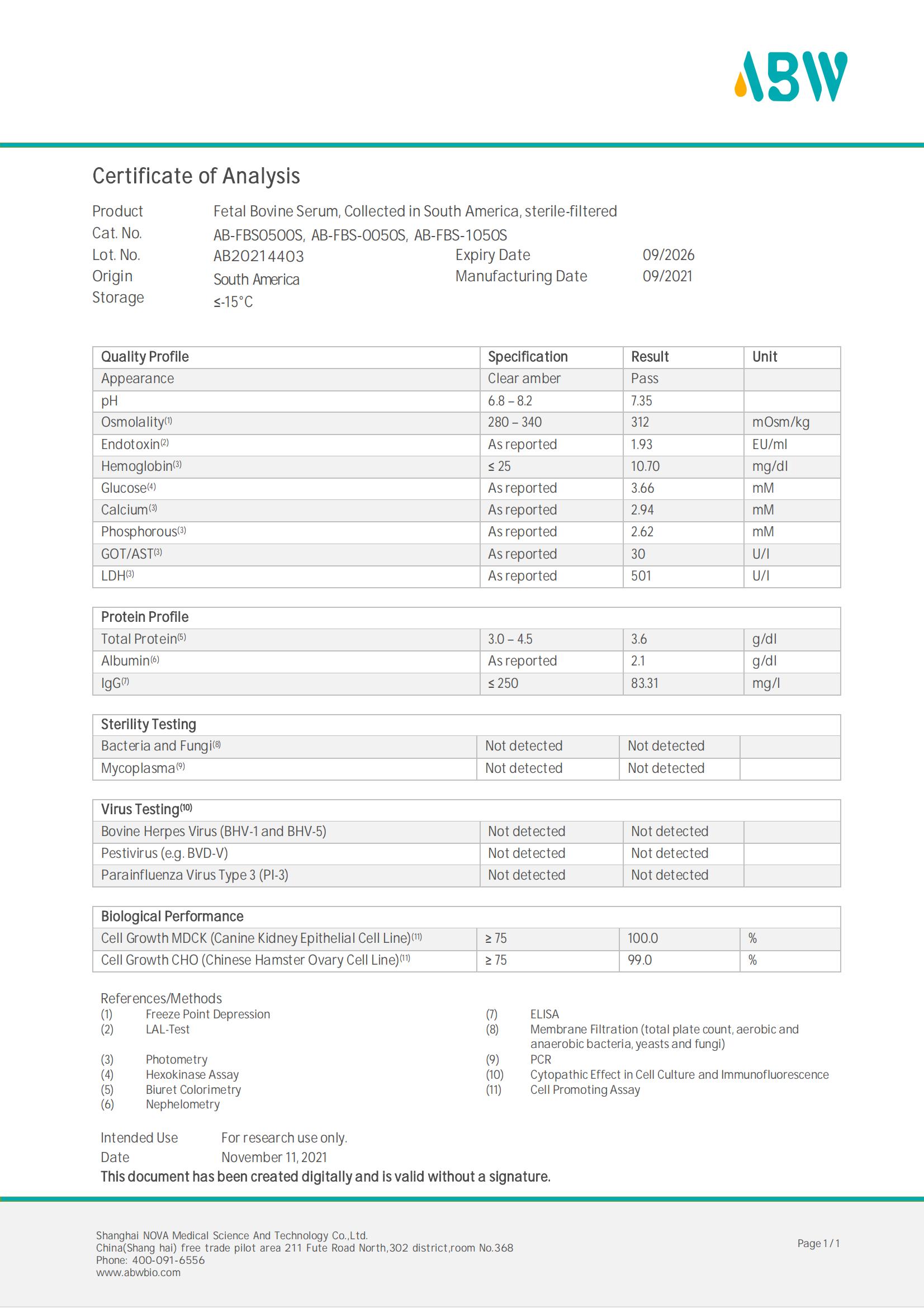 上海諾娃醫藥成立于2017年1月,是一家專業從事于生產、銷售細胞培養產品干細胞及干細胞專用無血清培養基等產品的創新型科技公司。 公司產品主要包括:胎牛血清,細胞庫,干細胞,臍帶間充質干細胞專用無血清培養基,無血清凍存液等眾多細胞培養產品。