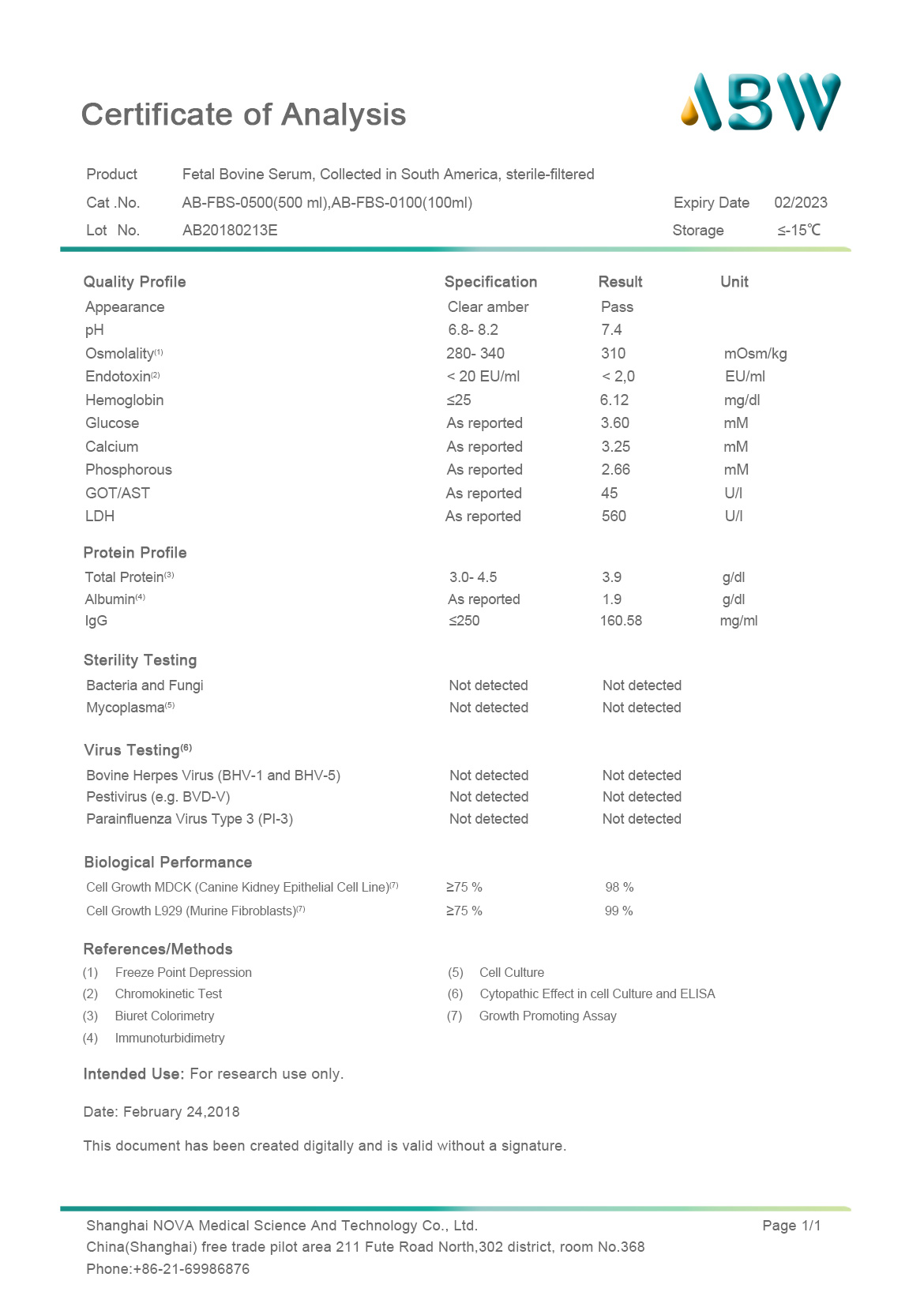 ABW血清產品血源地來自烏拉圭,德國工藝加工,原裝進口產品,批間穩定性高。