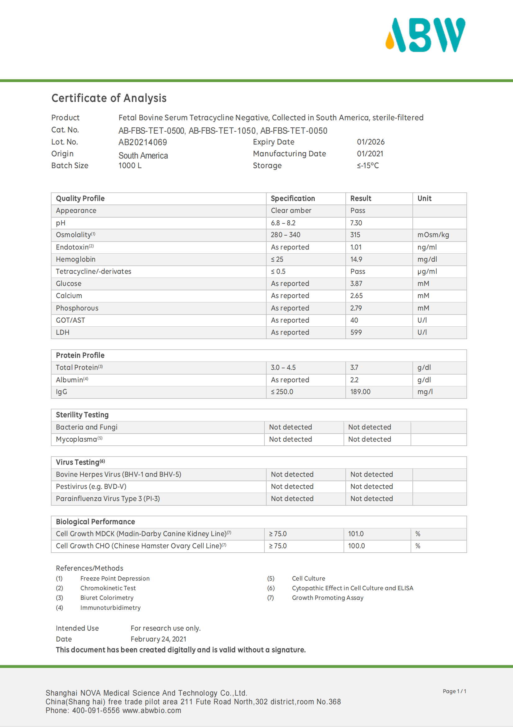 ABW血清產品血源地來自烏拉圭,德國工藝加工,原裝進口產品,批間穩定性高。